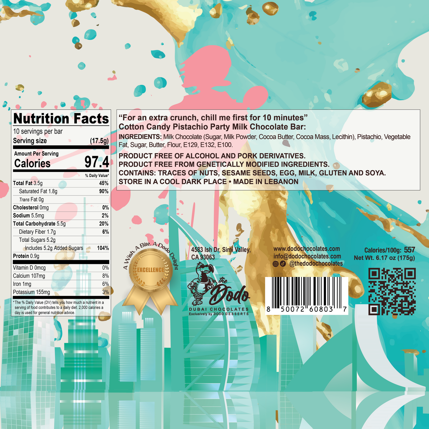Available for a limited time only! Don’t miss out on the chance to experience the magic of The Dodo Chocolates Viral Cotton Candy Pistachio Party Bar!
